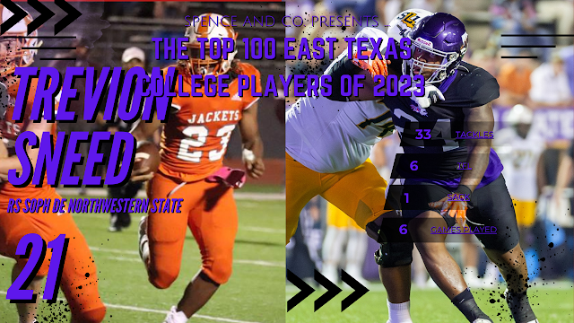 Before leaving for SMU, Trevion Sneed was the number 5 player on the Top 100 of 2021 list. Before Northwestern State was forced to shut their season down early, Sneed was going off. Mineola's Trevion Sneed was a man at defensive end, racking up over 30 tackles in 6 games and 6 tfl.